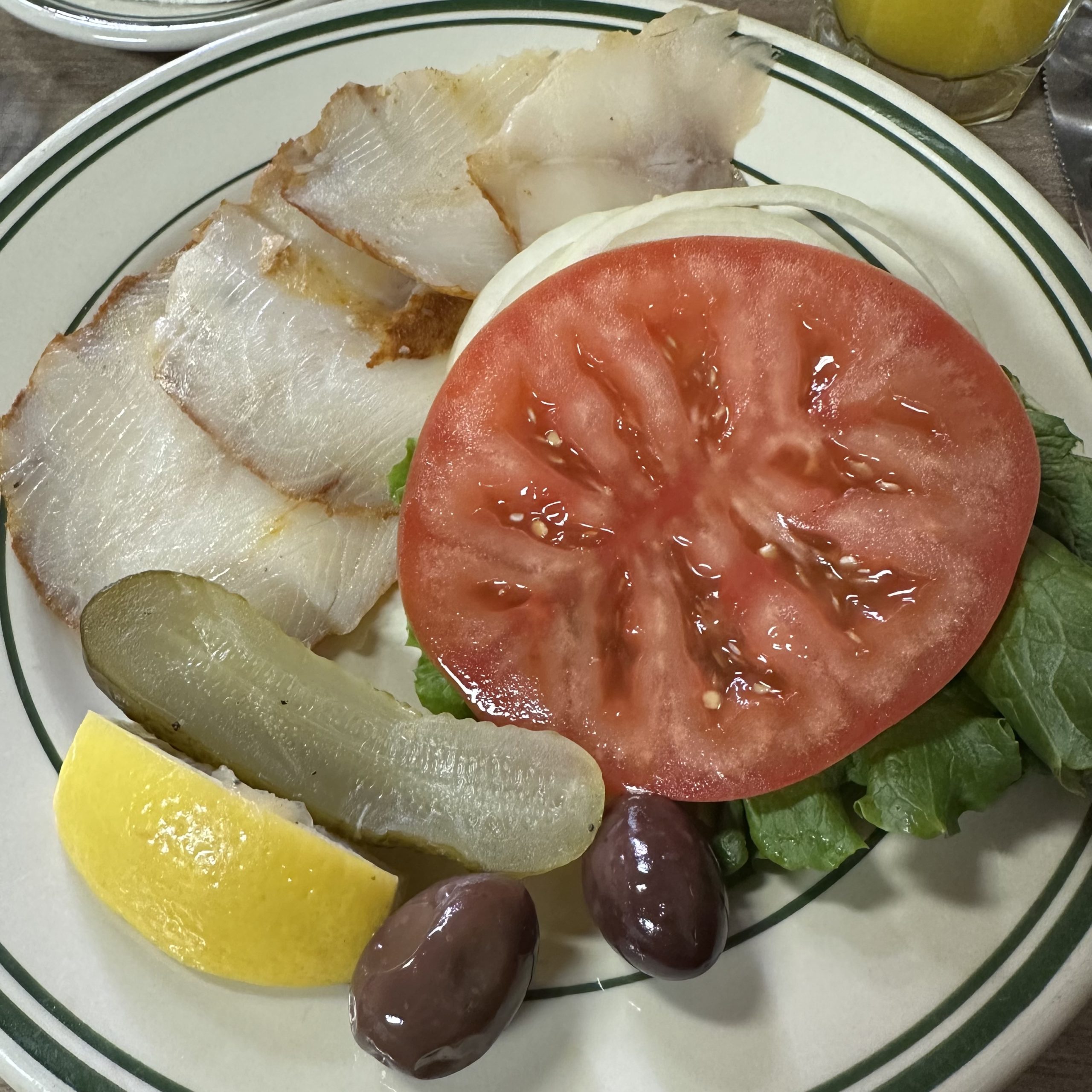 We devoured smoked sable on fresh sesame bagels. The secret is to order the appetizer plate which is enough for two and much less than the full platter.