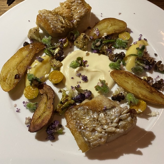 Our entree was the Vermillion Rock Cod “En Ecailles” perfectly sautéed with charred cauliflower, Meyer Lemon, fingerling potatoes and a unique Pichuberry ($38).