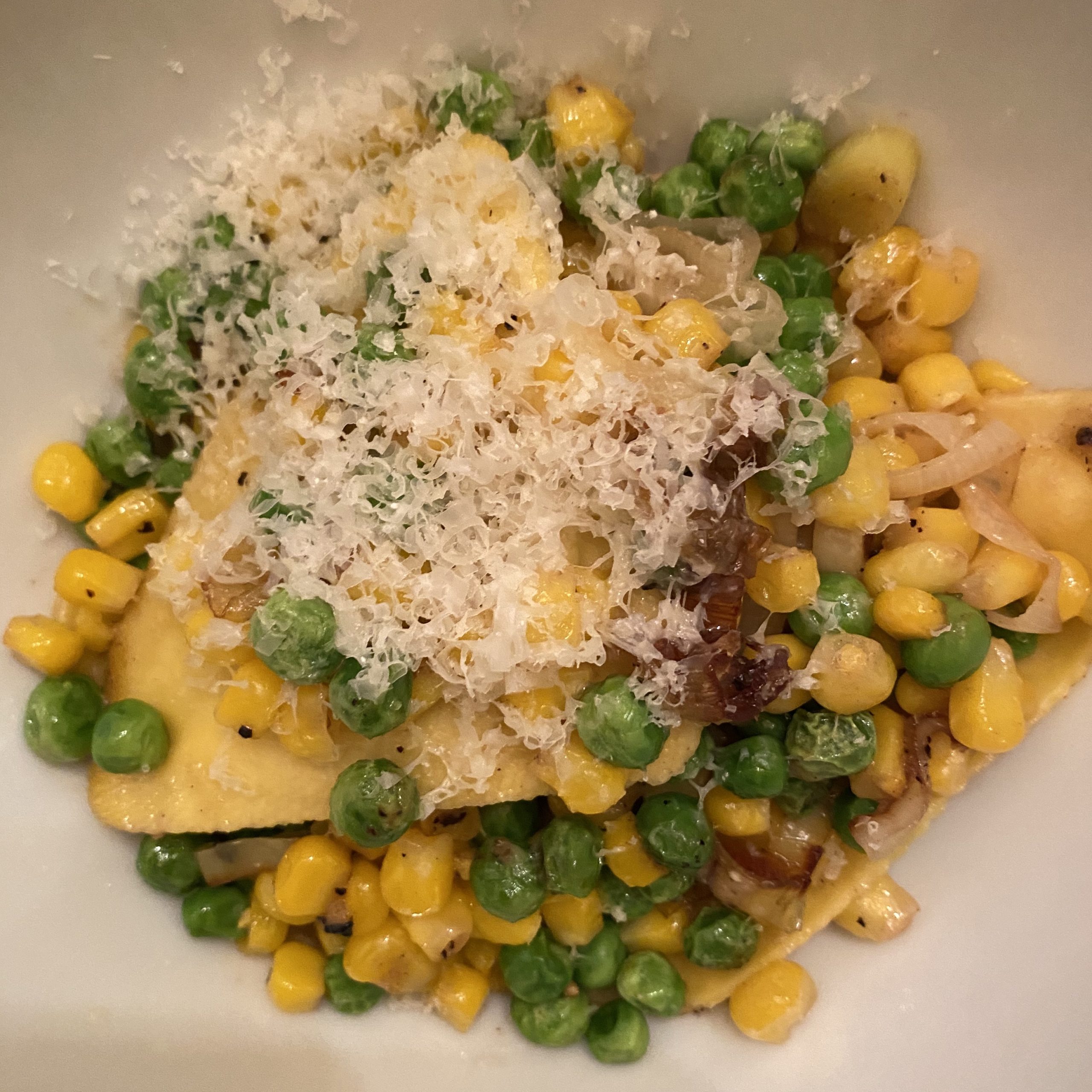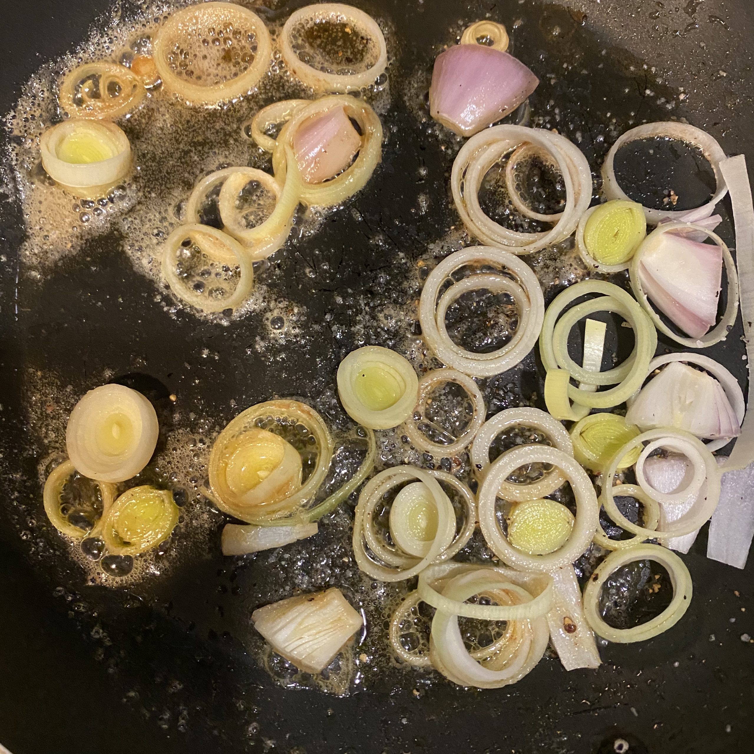 When the leeks are starting to turn golden I toss in frozen peas and corn.