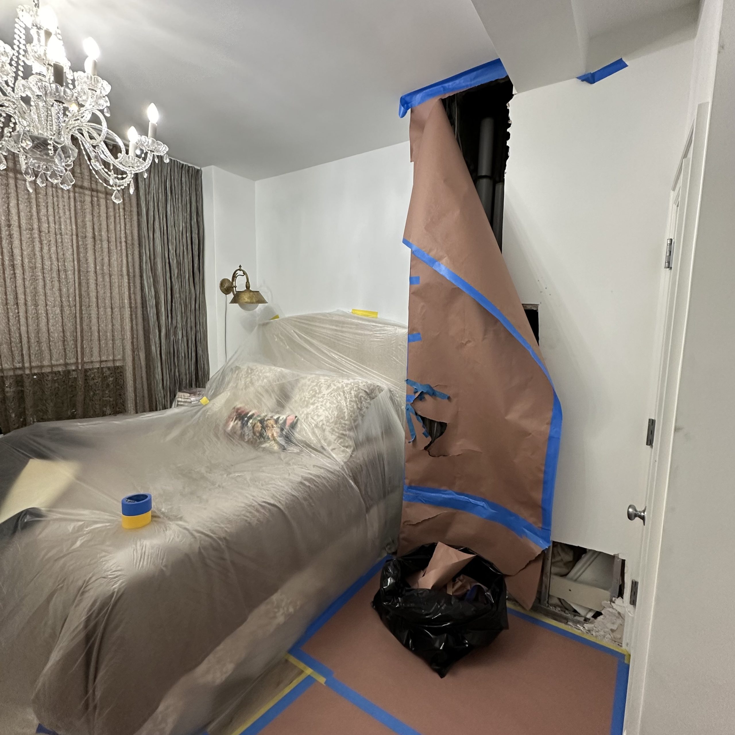 Almost two weeks of cluttered rooms, strewn clothing, cleaning supplies stacked up, trash can in the living room, new rug rolled up in shipping material at the door, shoes under the couch, lamp and misplaced table in the kitchen, drop clothes everywhere and the ultimate dilemma, Finnley cannot sleep on the bed because it is encased in plastic.