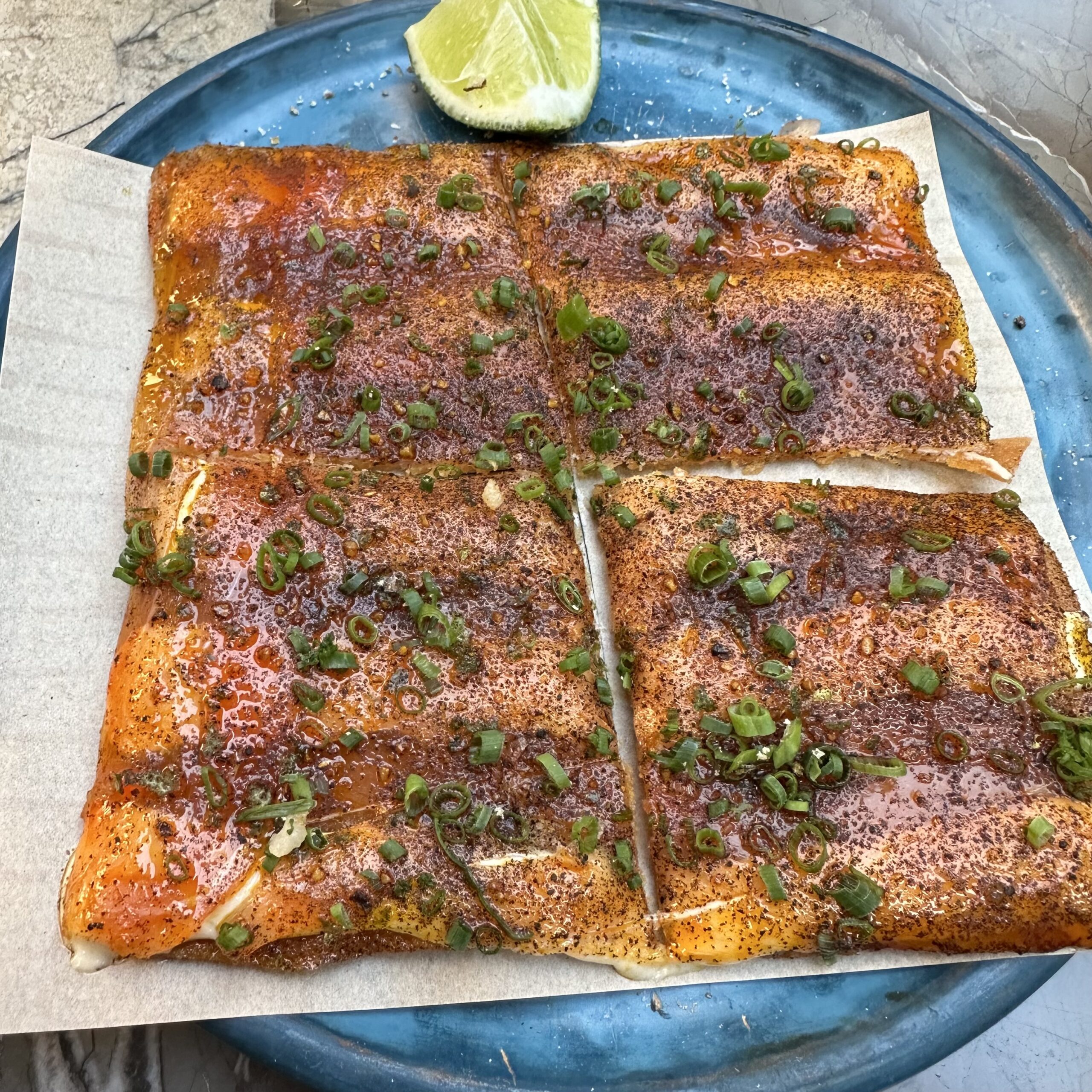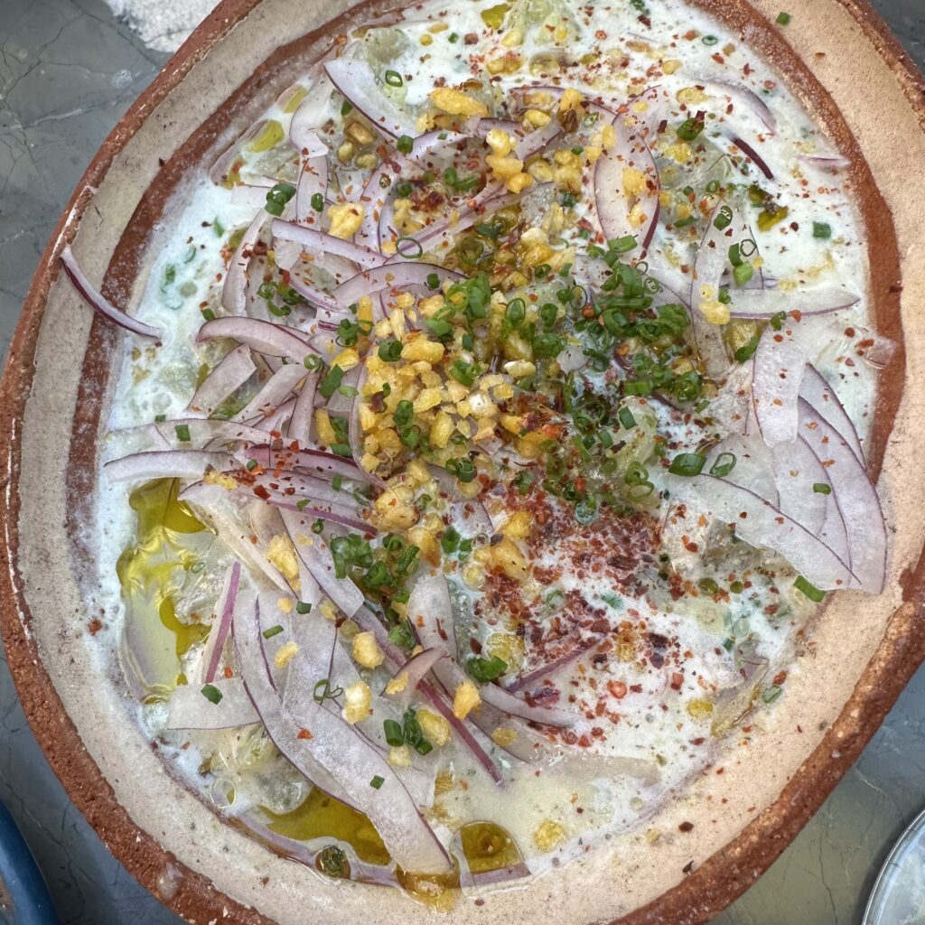 Our starter was a delicious, creamy Yuca Tostada with Tuna ($16). The perfectly square, delicately crisp yuca rafts are deep-fried and topped with paper-thin slices of raw tuna, cachucha aioli, black lime, herbs, achiote oil and served with a lime wedge. It would make a fabulous pizza ($16).