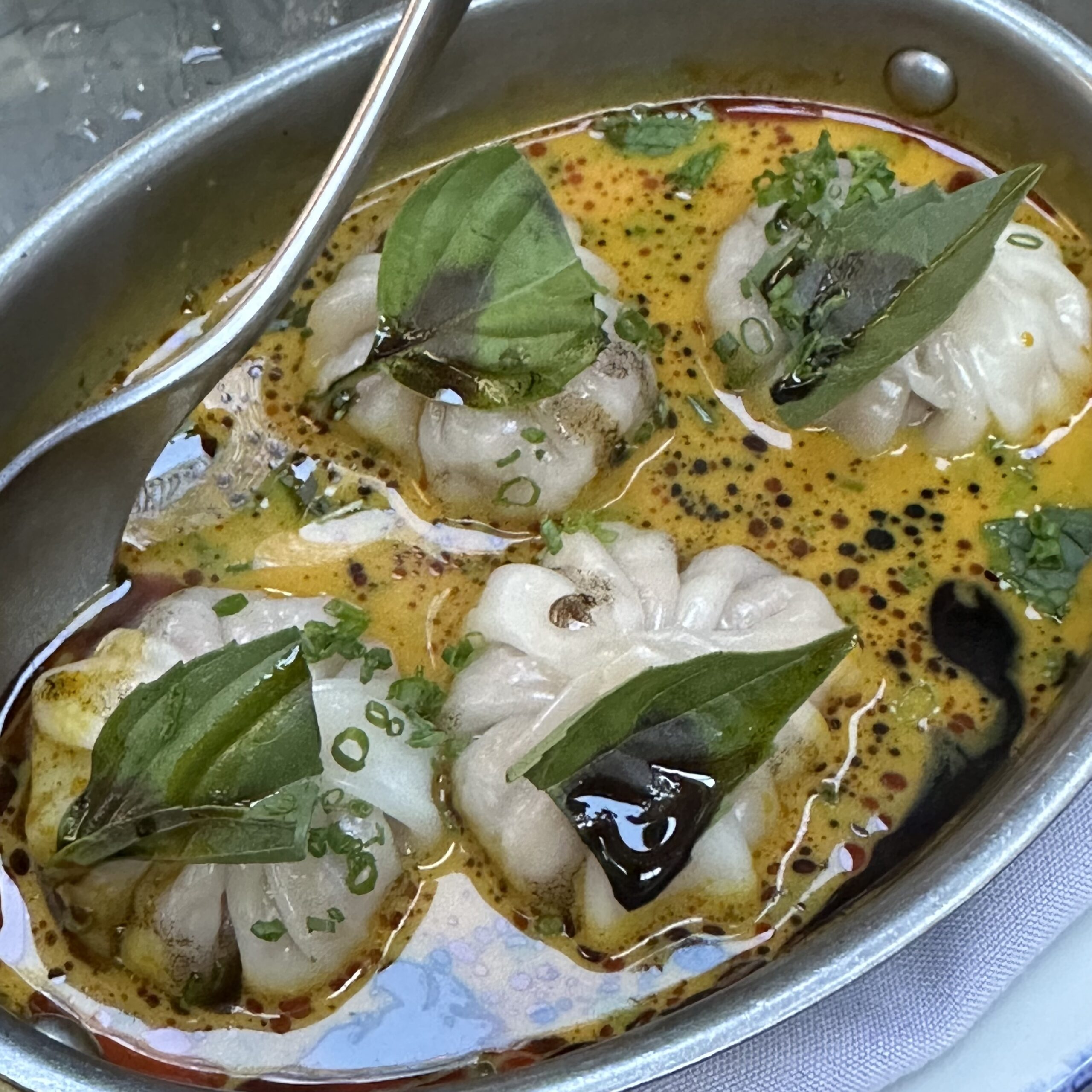 The Panamanian-style dumplings bring together Chinese and Afro-Caribbean flavors. Filled with chopped shrimp, shrimp mousse, Panamanian-style sofrito, herbs and aromatics, the dumplings are served in a shrimp bisque with a coconut curry reduction and finished with burnt scallion oil.($25).