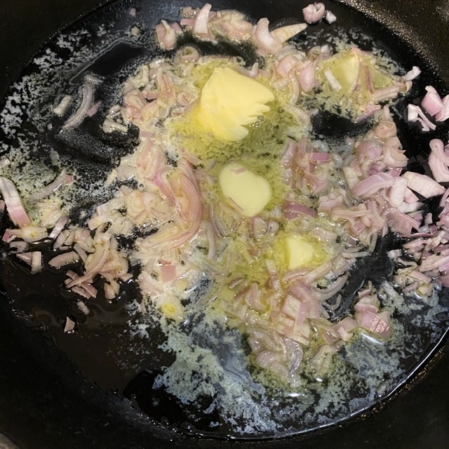 In a large skillet, I use a large cast iron pan, over medium heat, melt butter and shallots/garlic.