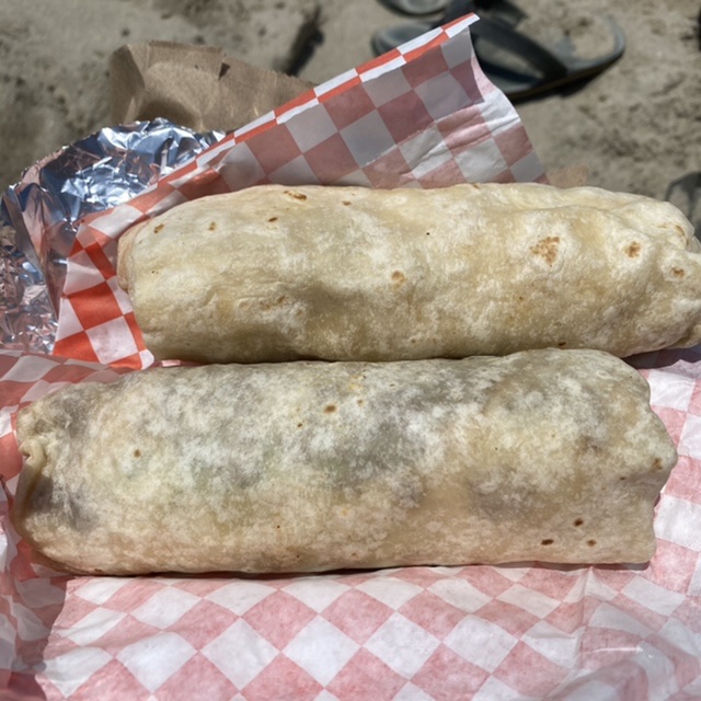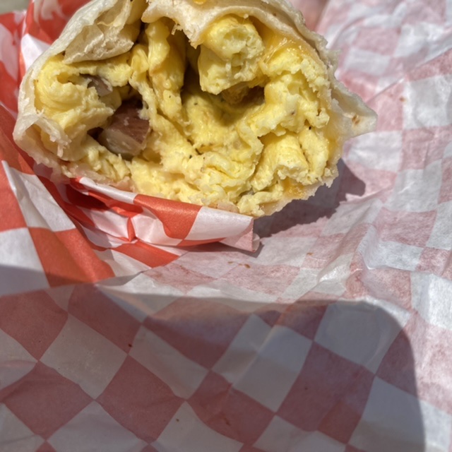 David ordered the Breakfast Burrito with eggs and potatoes. Bacon and sausage are also included, but meat is not his thing.