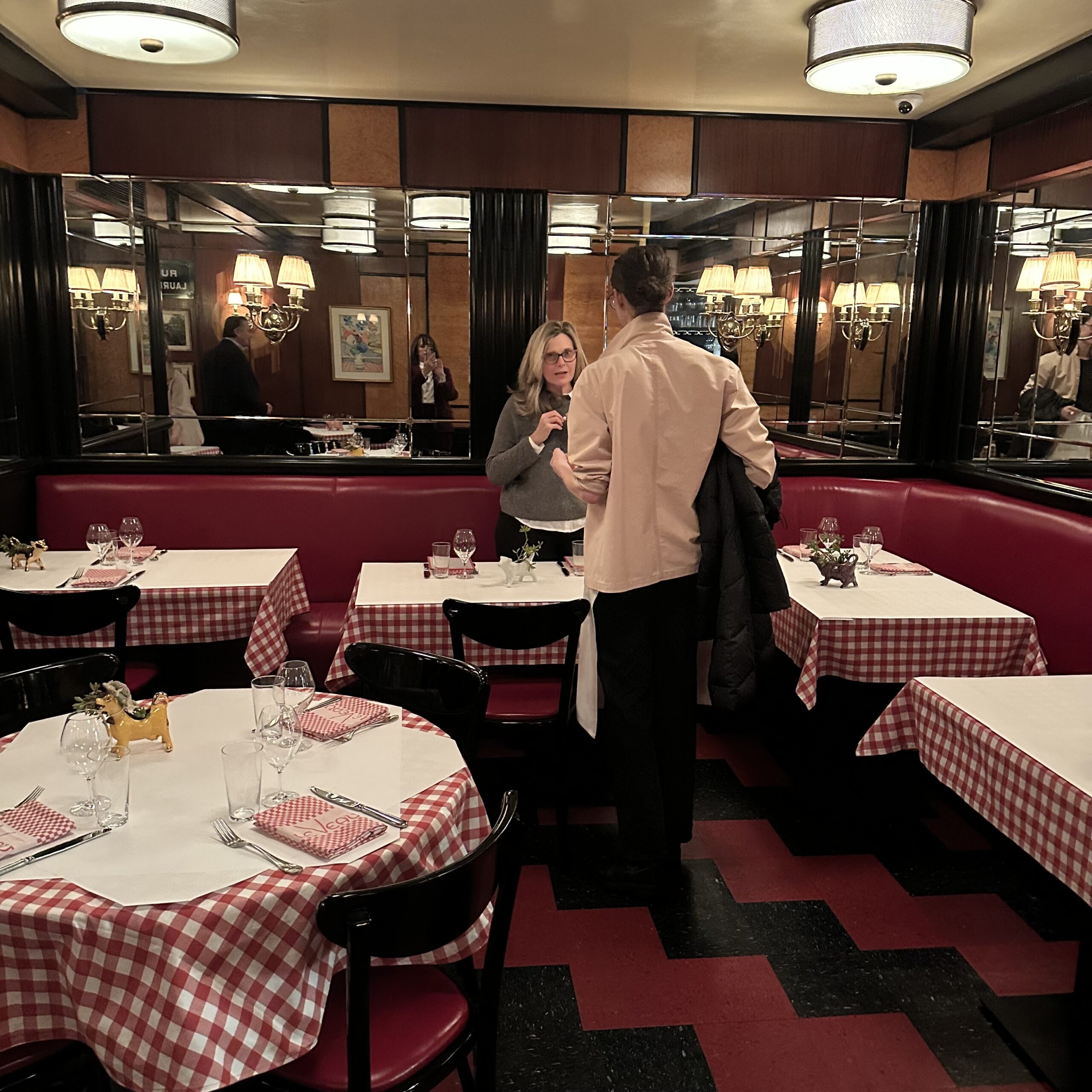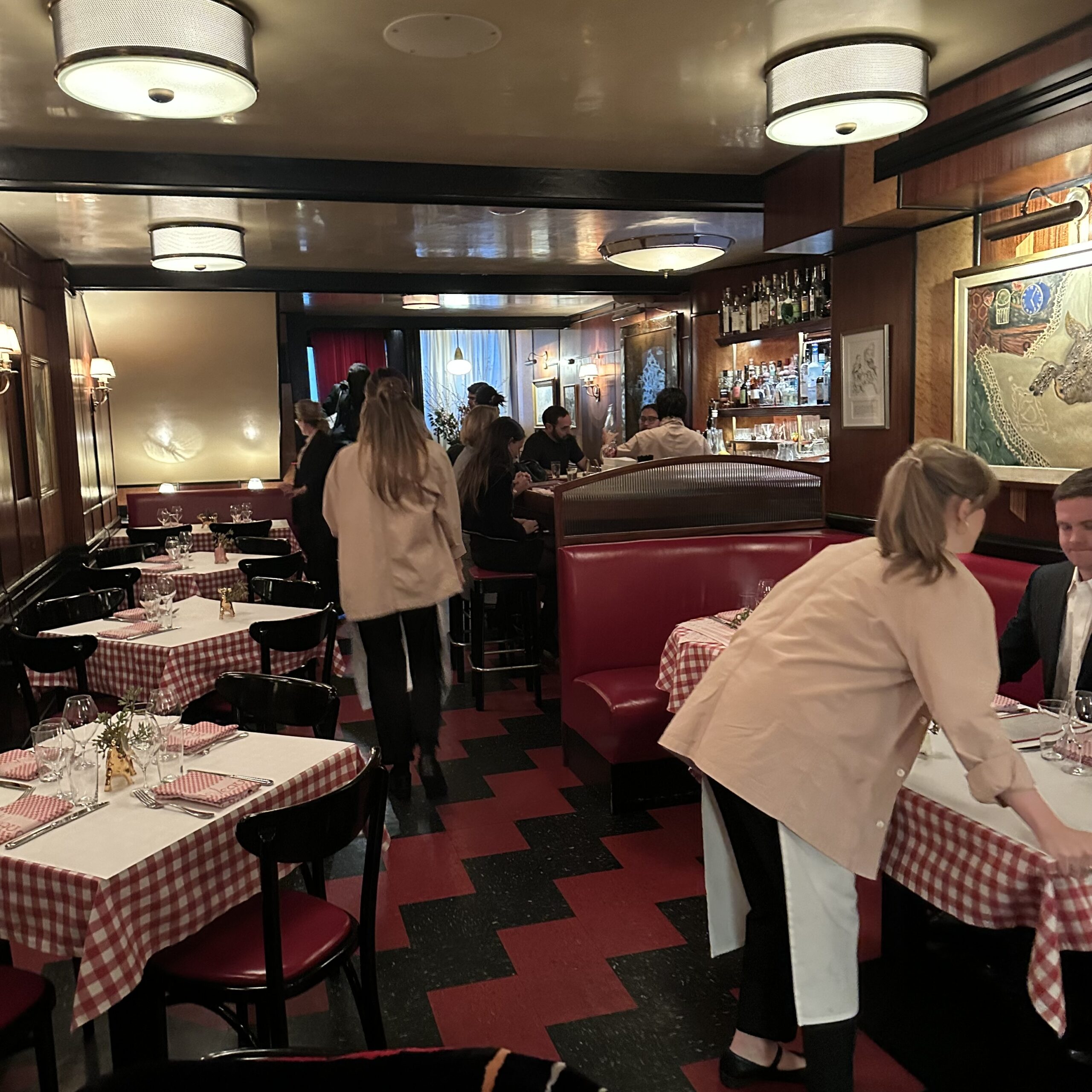 The intimate room seats 55 with a six seat bar. The restaurant features red banquettes, wood paneling and red-and-white-checkered tablecloths, just like when the restaurant opened. The flooring is a red and black pattern from the 1960s version of the restaurant.