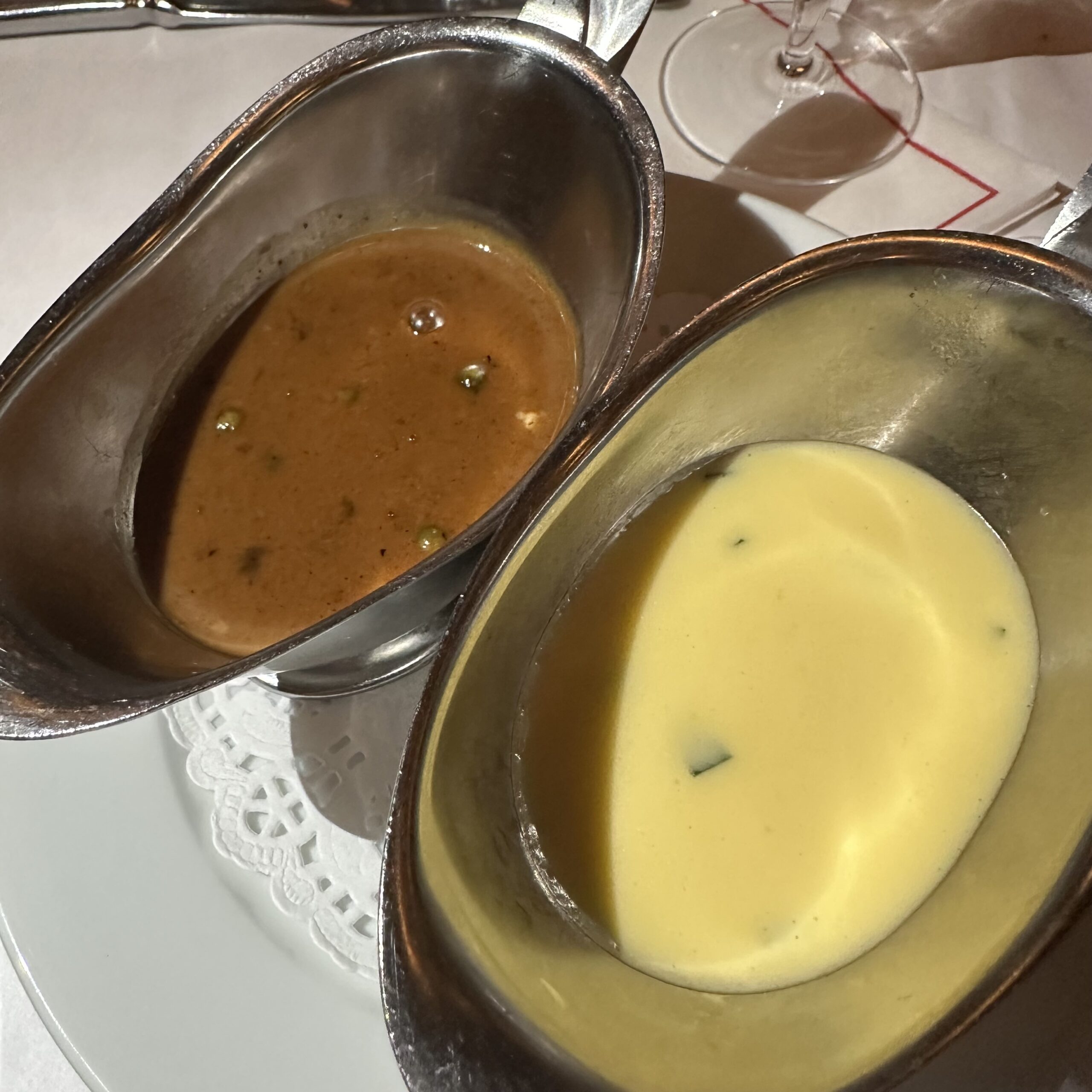 My plentiful, tender Hanger Steak served with a delectable Bearnaise and Au Pouvre sauce was outstanding.