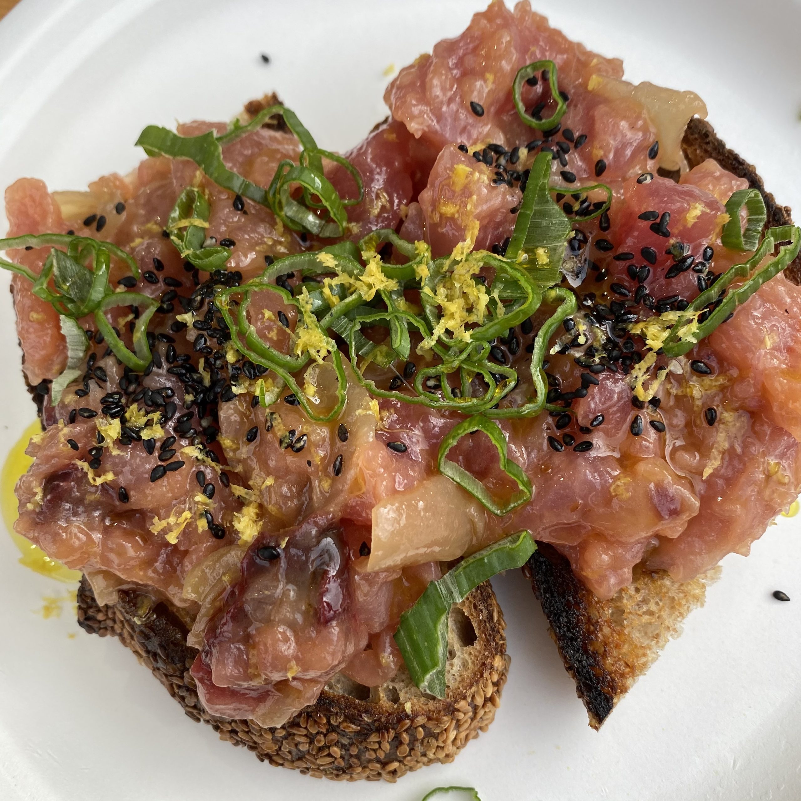 The Hook and Line Tuna Toast stable was off the charts amazing. It is comprised of the sweetest fresh tuna tartare on seeded Gjusta bread, new onion confit, shrimp stock and black sesame. Do a drive by just for this dish ($15).