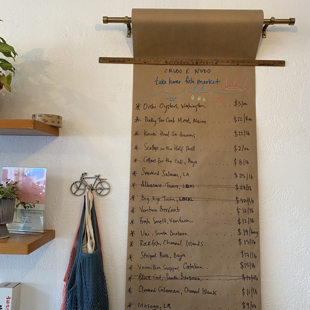 Crudo e Nudo 2724 Main Street Santa Monica, California. Reservations available through Resy. Initial hours will be 11-6pm, Wednesday to Sunday, with coffee served 8-11am via Lenny’s. Street and lot parking available.