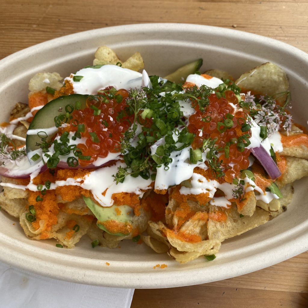 Leena surprised us with Dips on Chips…masago ikura and bottarga, creme fraiche, house Calabrian sauce, chives served over Torres potato chips ($14).