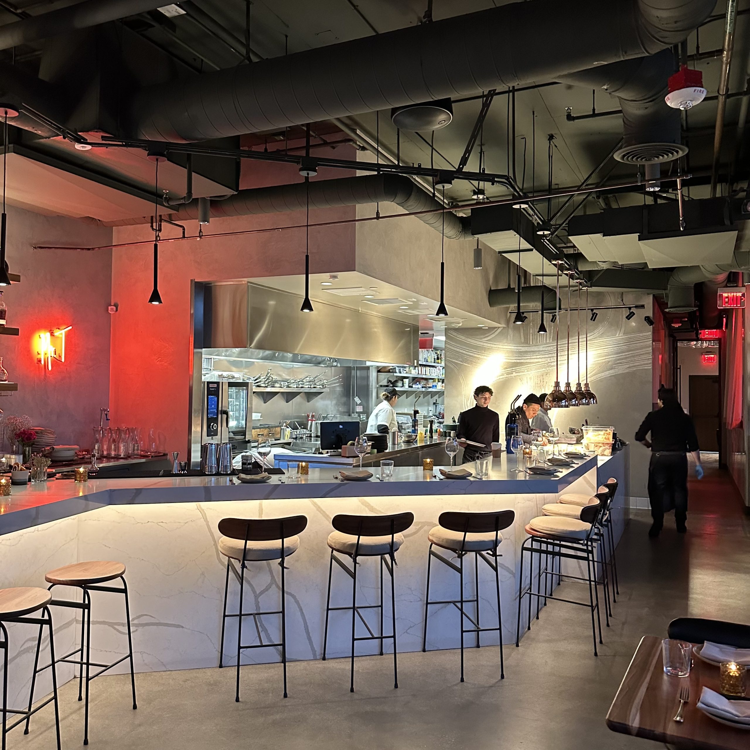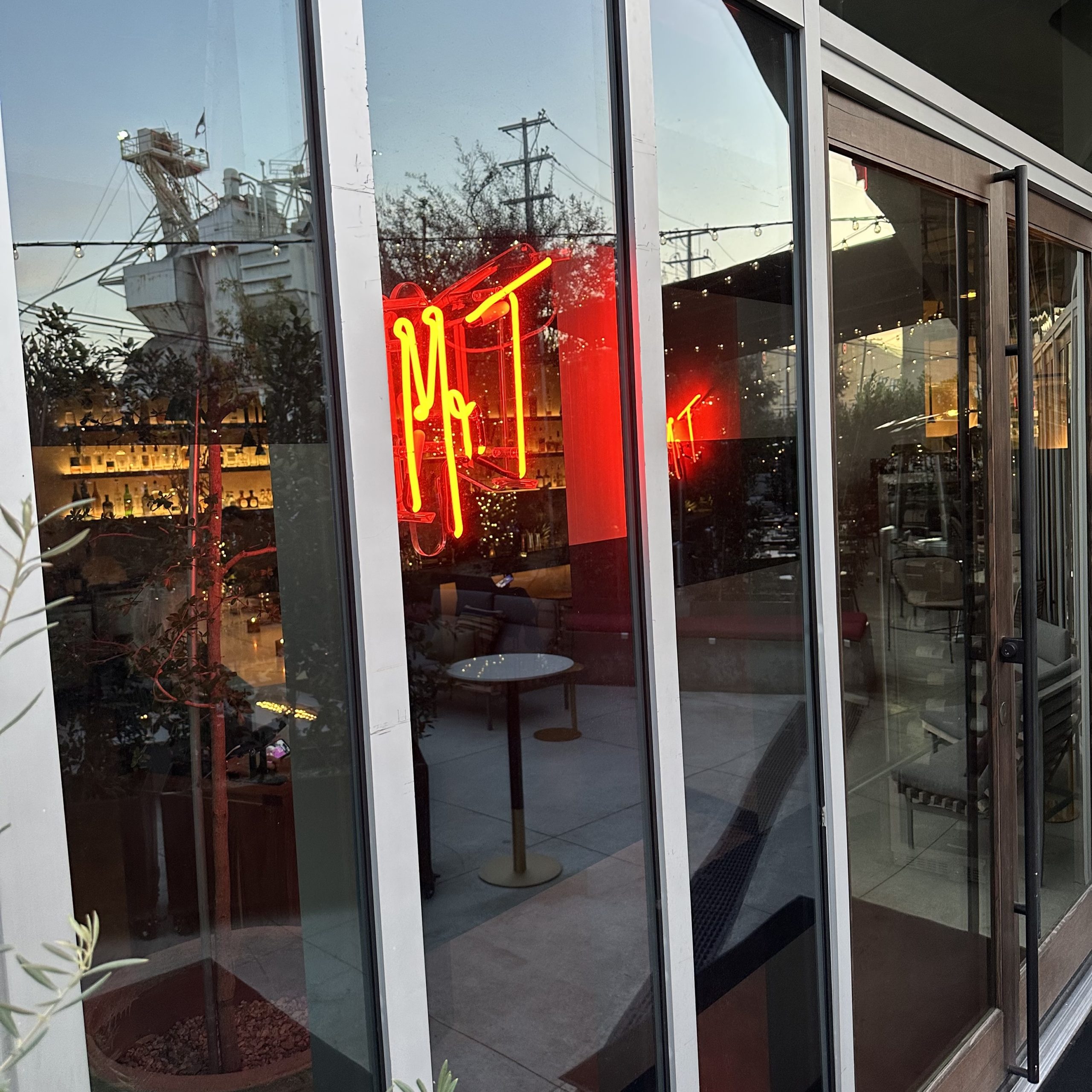 Mr. T’s open-air space is minimalist, decorated with red neon signs that spell out the restaurant’s name. There is an attractive outdoor terrace.