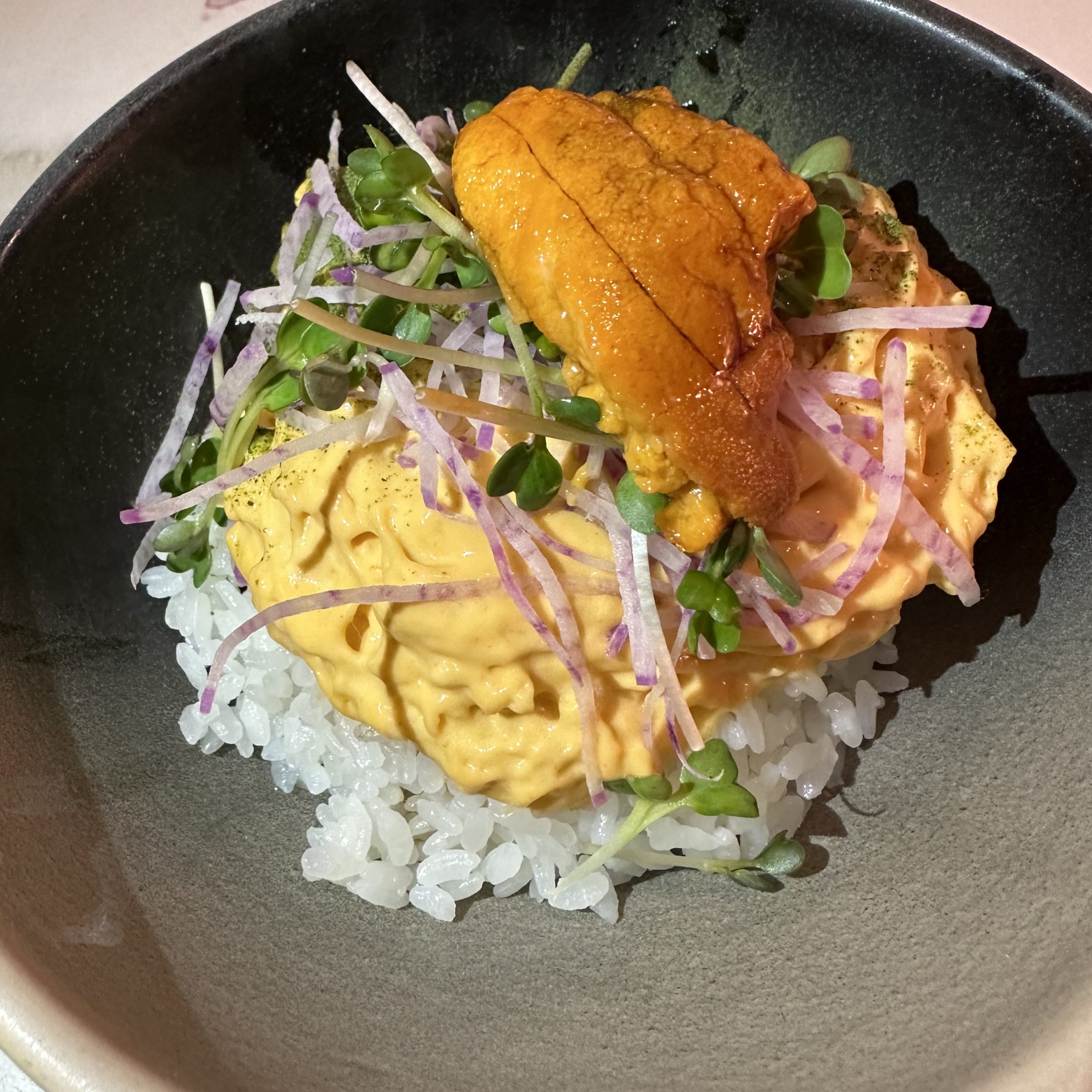 The uniquely creative and delicious Santa Barbara Uni on Koshihikari rice with confit egg yolk and ponzu sauce is off the charts fabulous ($32).