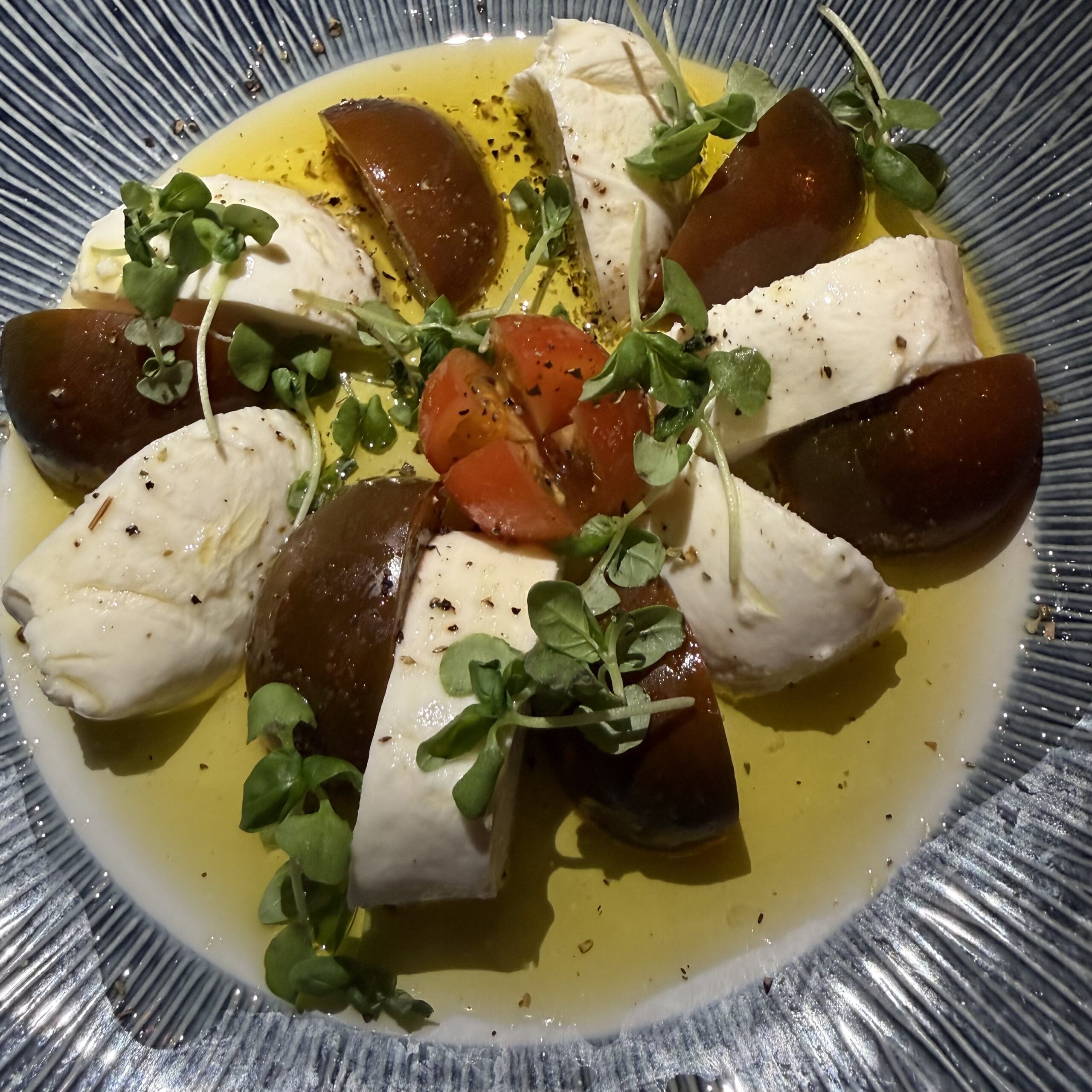 Our opening act was a Caprese Salad comprised of firm and sweet Buffalo Mozzarella with ripened tomatoes and a hint of basil accompanied by a jumbo bottle of aged balsamic ($17).
