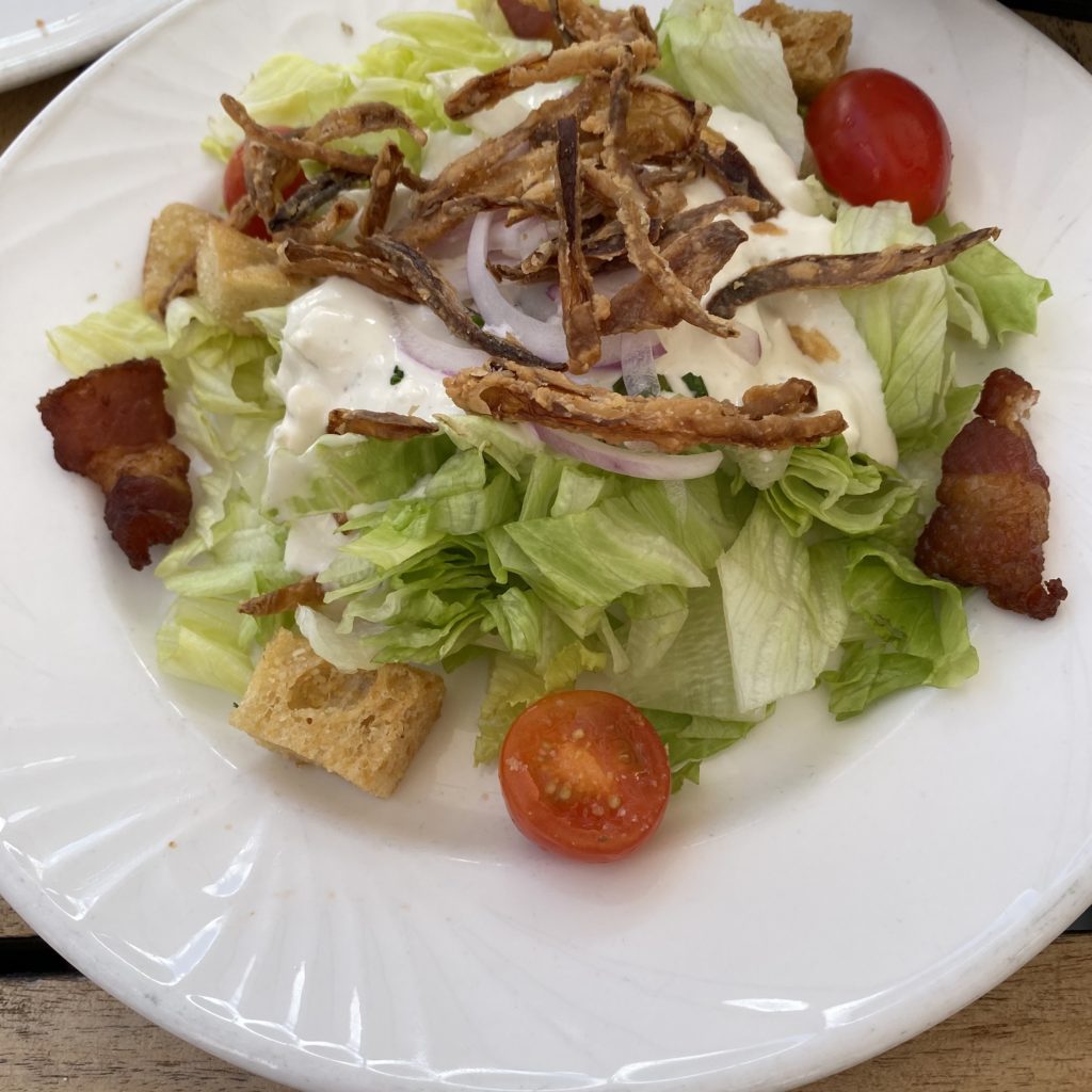 The Iceberg Wedge with lardons, tomatoes, croutons, creamy blue cheese dressing, chives, red onions and fried shallots was mediocre and not chilled and crispy. The dressing was overdone ($15).