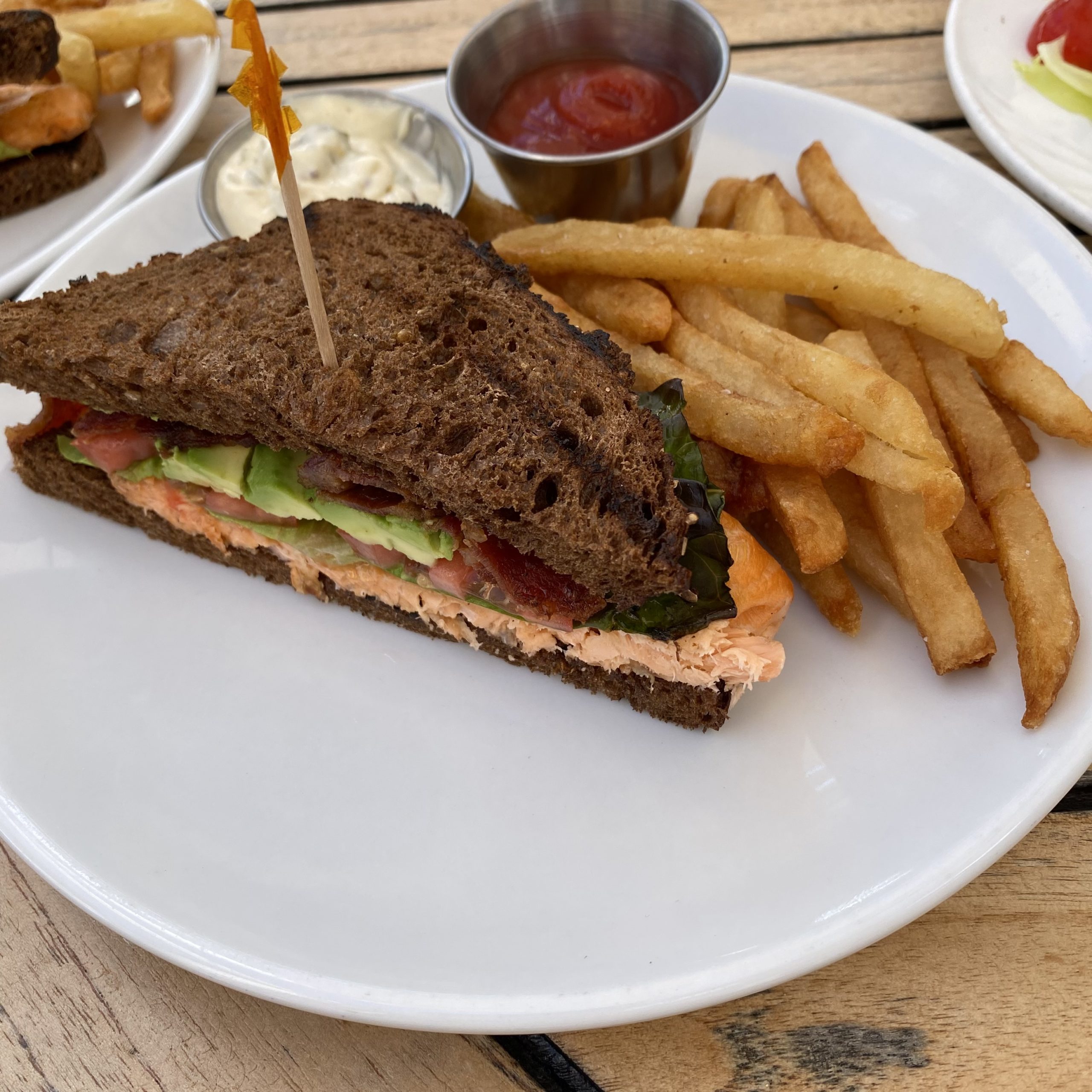 We selected the Salmon BLT on black bread with avocado and remoulade. The salmon had a strong flavor, the bacon was not crispy and a dark rye bread did not cut it ($19).