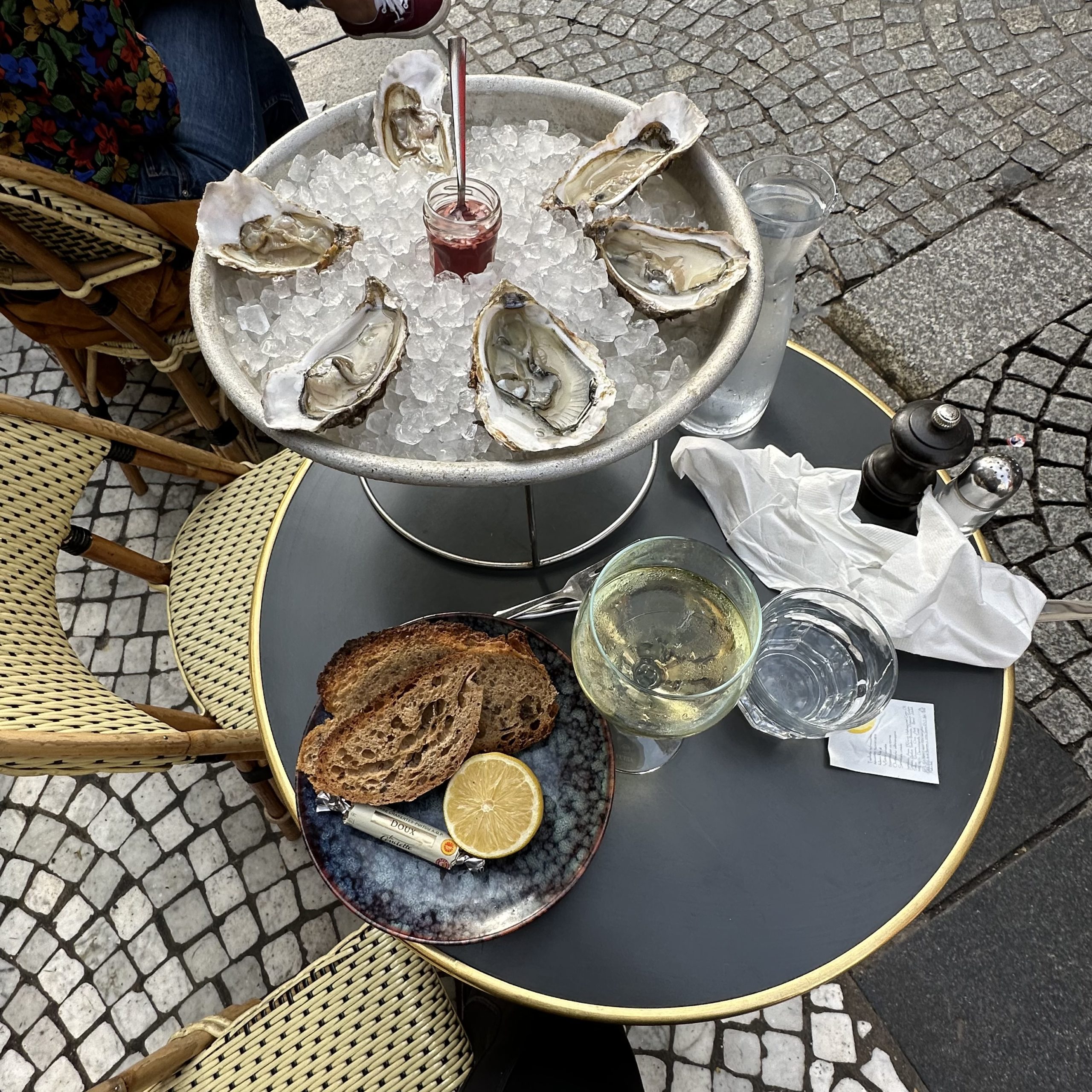 After parting, I spotted the restaurant Au Rocher de Canale and sat outside in the sun with a lovely glass of Viognier and a half dozen oysters from the divine Cancale region in Brittany.