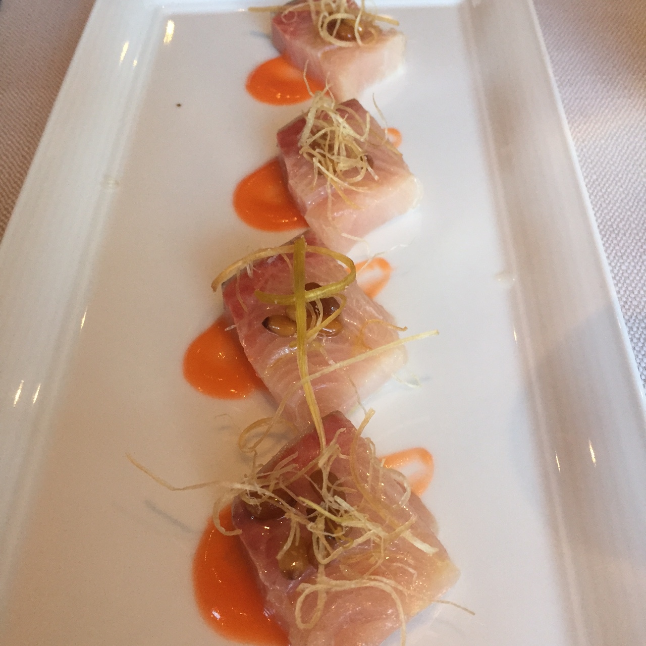 After the freshly baked bread was presented, we kicked off the meal with the incredibly fresh crudo, Sgombro, composed of Pacific Jack Mackerel with carrot puree, lime and pine nuts which were a wonderful accent.