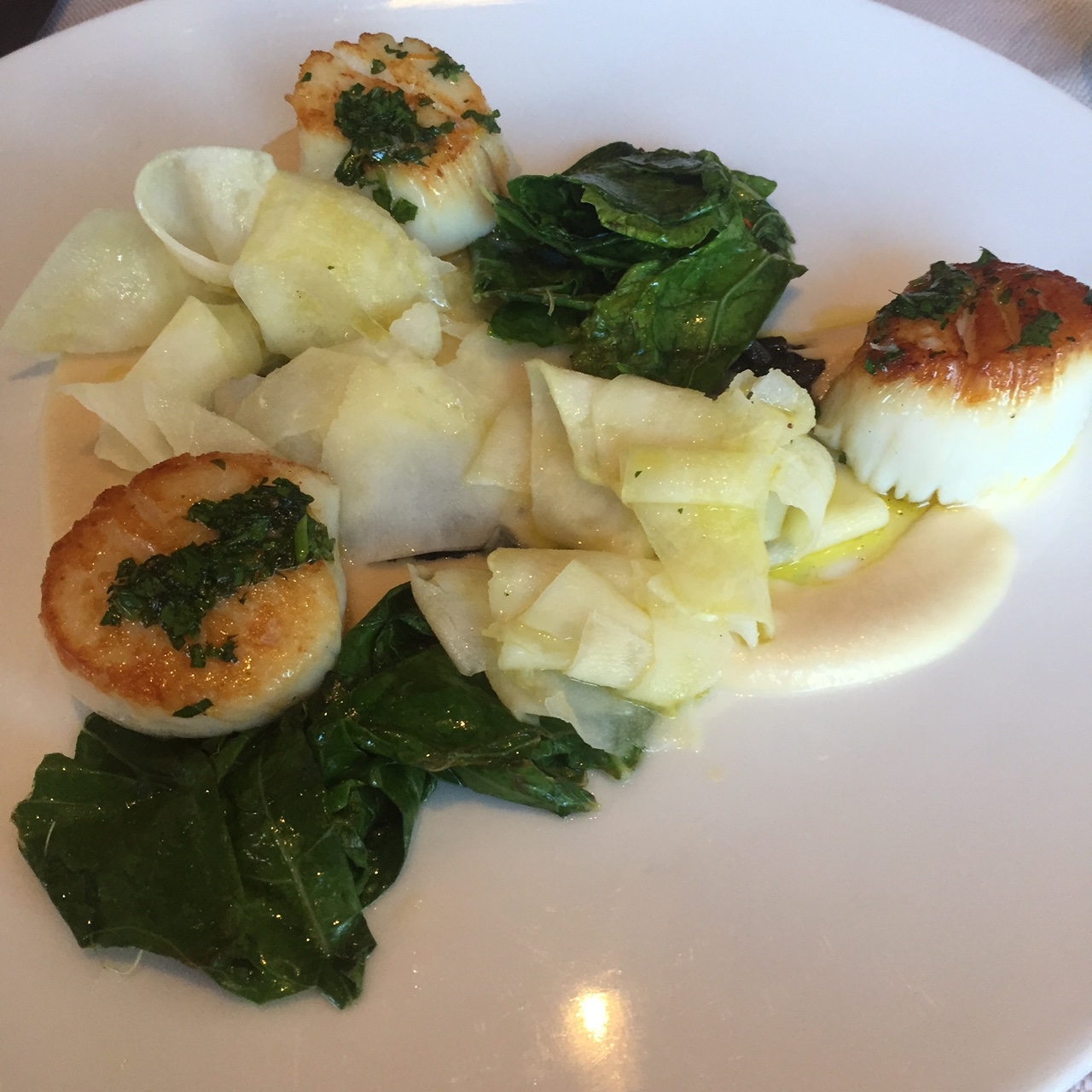 Our final shared course was the divine Capesante, Seared Sea Scallops with smoked sunchokes, wilted greens and gremolata.