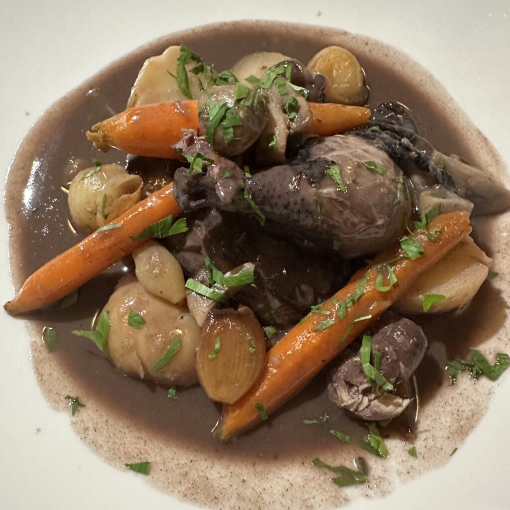 I selected the tender, perfectly prepared Coq Au Vin, braised chicken in red wine sauce with fabulous carrots, mushrooms, pearl onions and potatoes (a la carte $28).