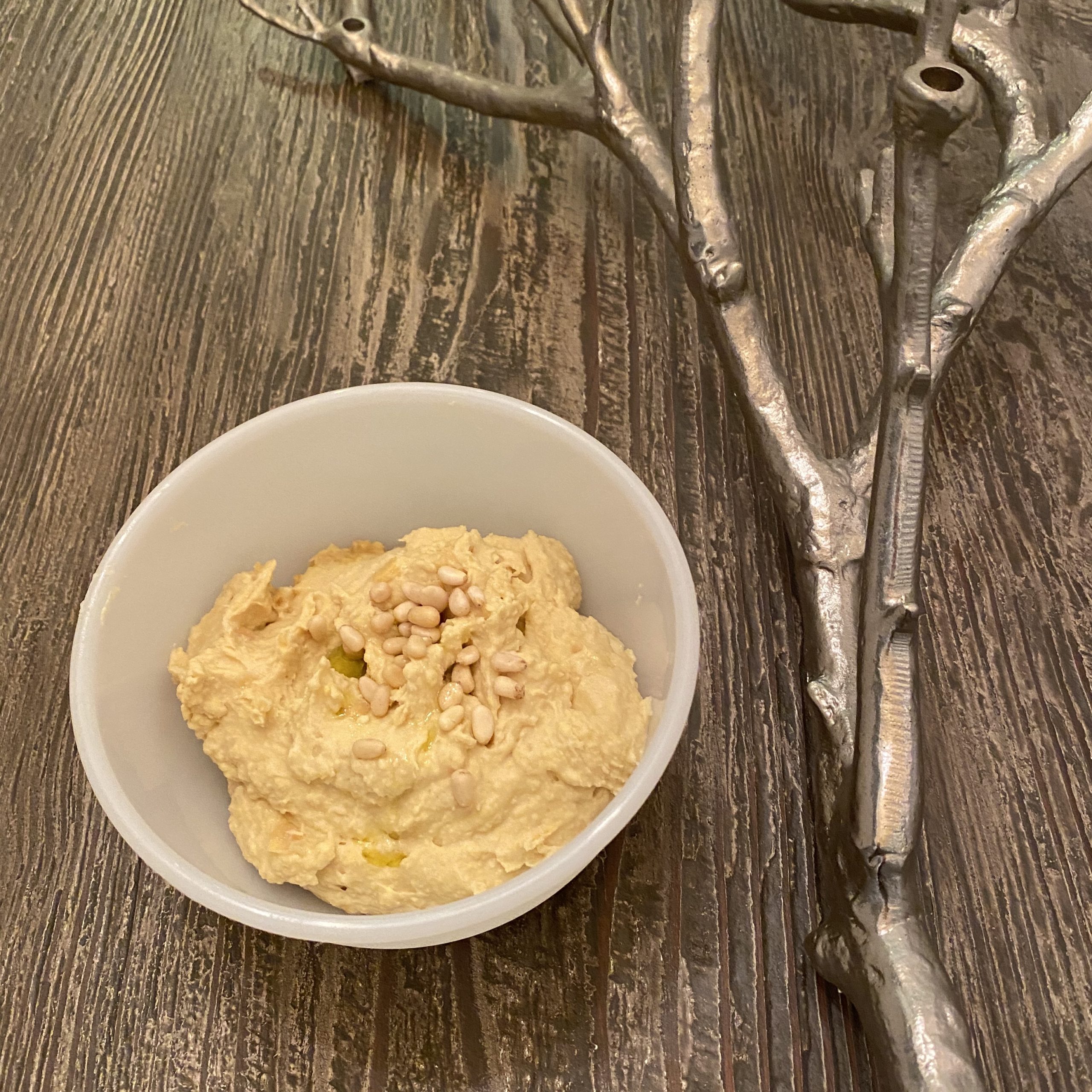 Place hummus in dish, sprinkle with pine nuts and drizzle EVOO on top.