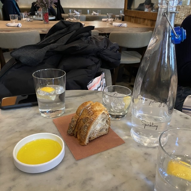 A bottle of olive oil is left on the table, accompanying crispy rustic bread sprinkled with rock salt perfect for dipping in the EVOO.