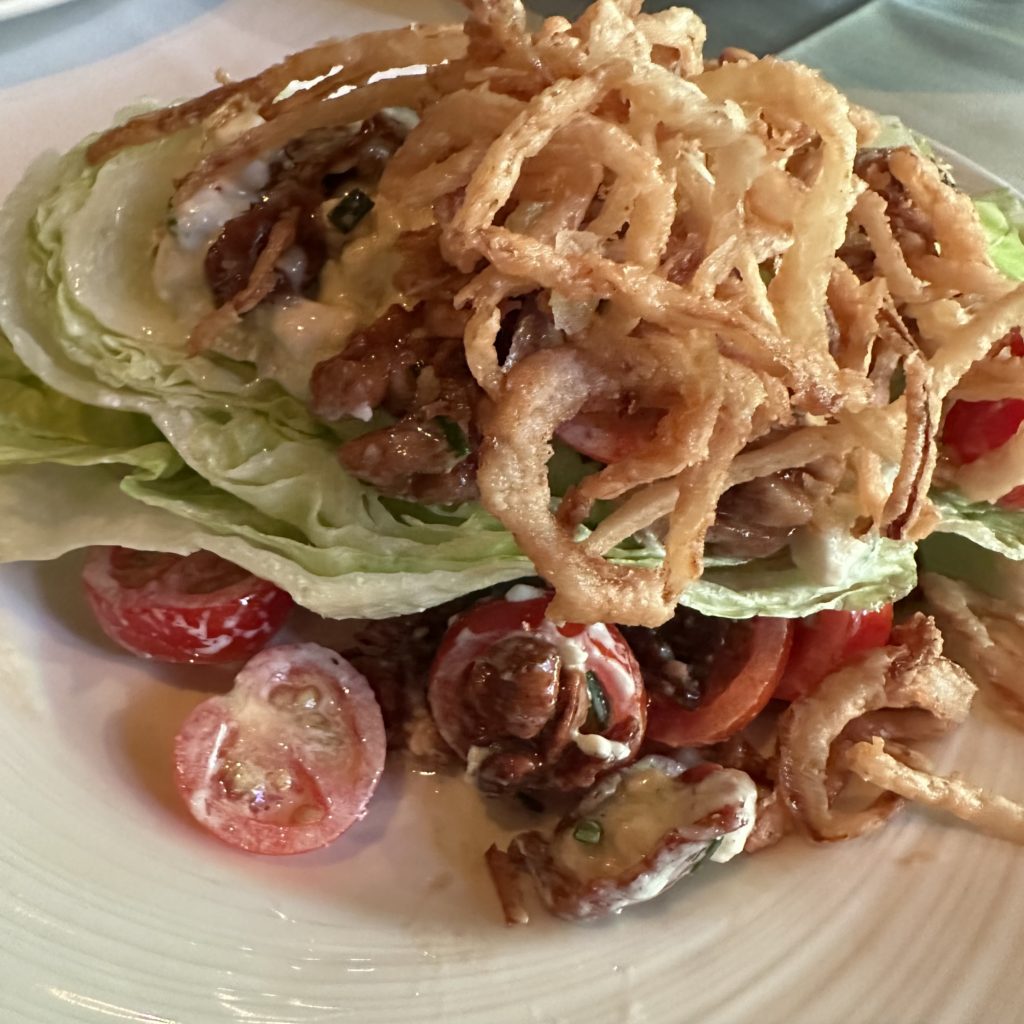 The huge salad (photo is only half of the salad) contains tantalizing Danish blue cheese crumbles, toasted walnuts, bacon, cherry tomatoes, chives and fried onions with a light lemon vinaigrette dressing ($15.50).