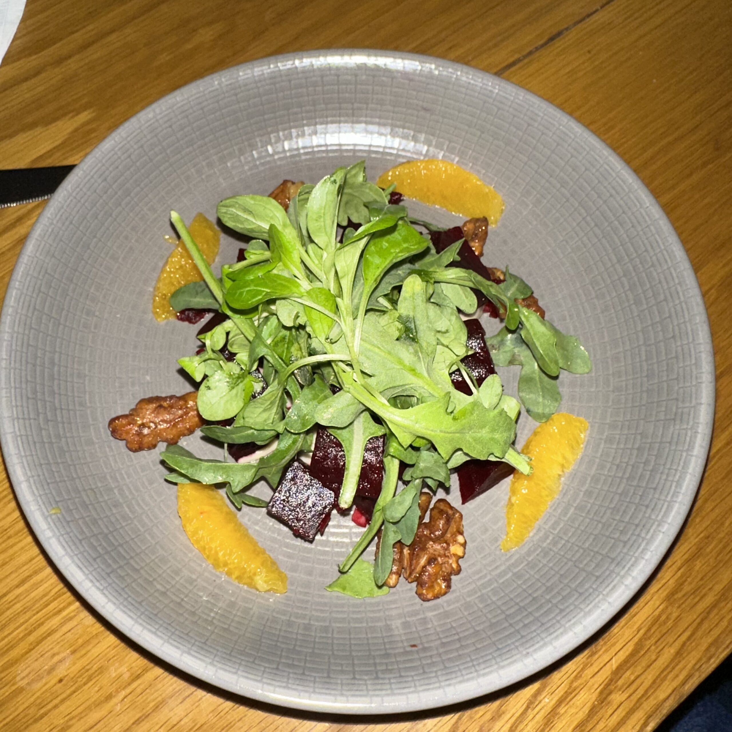 There was a new seasonal addition to the menu so we ordered the Roasted Beet Salad tossed with sesame, citrus, mâche and candied walnuts ($17).