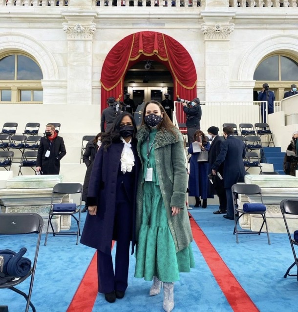 Meena Harris, Kamala’s niece, who is also an attorney, author and entrepreneur, was wearing a ruffled green Ulla Johnson top and matching skirt with embroidered detailing, topping the look with a green Coach shearling jacket in a similar tone and accessorizing the look with silver stiletto boots.