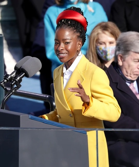 Loved the sunshine yellow color of Amanda Gorman’s Prada coat which highlighted the powerful words of the young poet sensation.