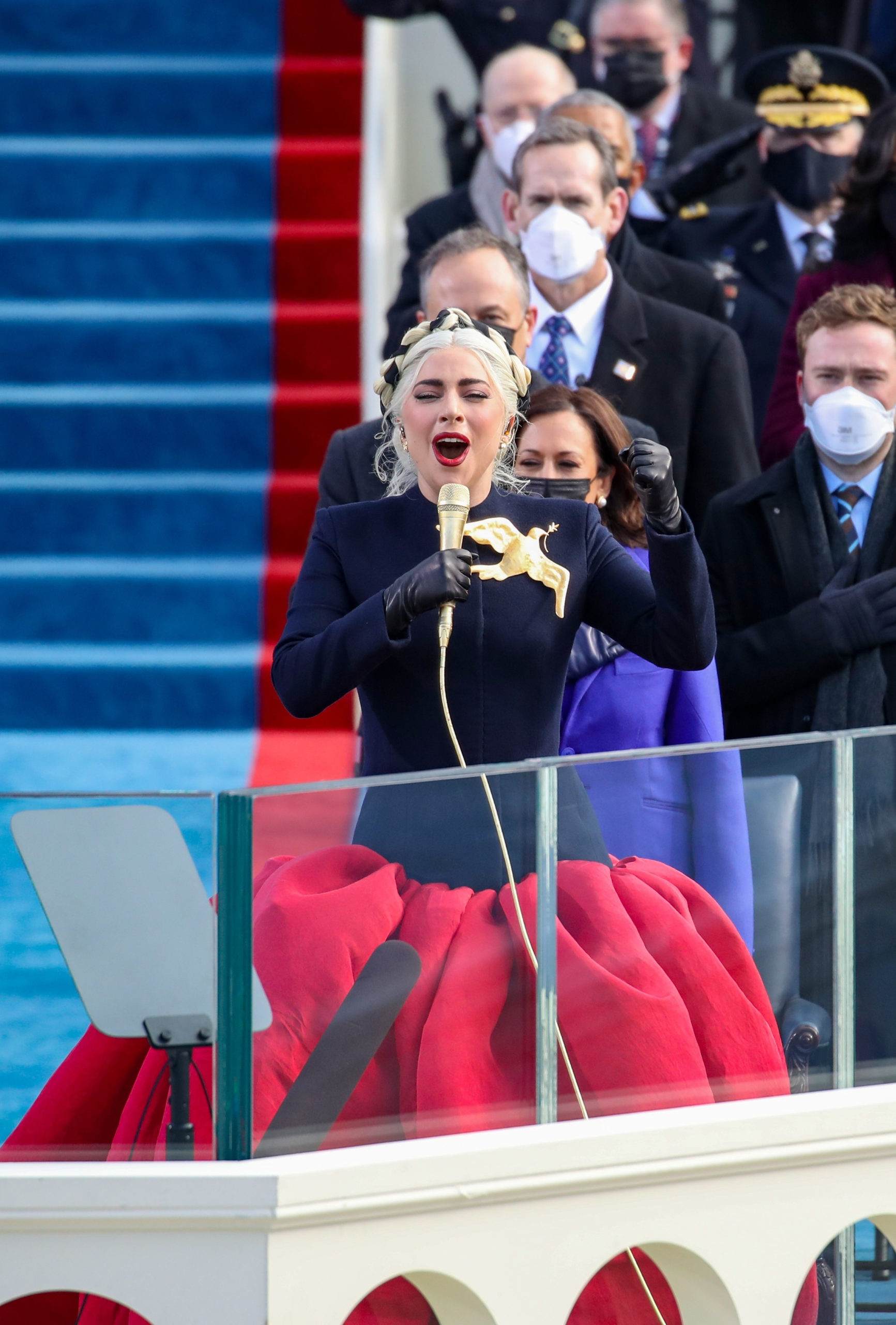 Gaga opted for a custom Schiaparelli haute couture design with a fitted navy cashmere jacket that gave way to a voluminous red silk faille skirt and Gaga included a gold mic accessory.