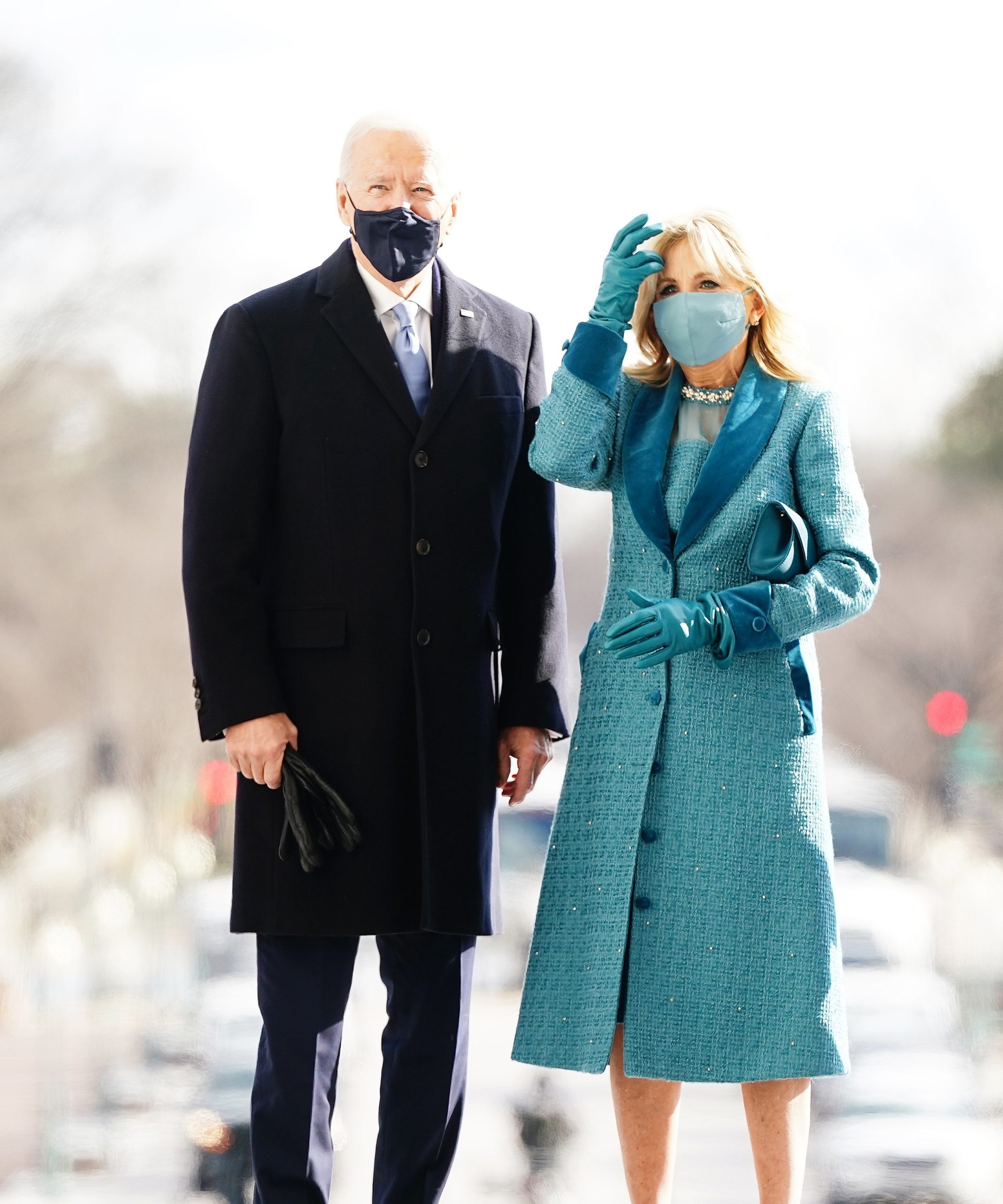 She selected an ocean-blue tweed coat with velvet cuffs, a dress embellished with Swarovski crystals and pearls (as well as a matching face mask) designed by Colorado-born designer Alexandra O’Neill of the emerging American label Markarian…and those gloves!