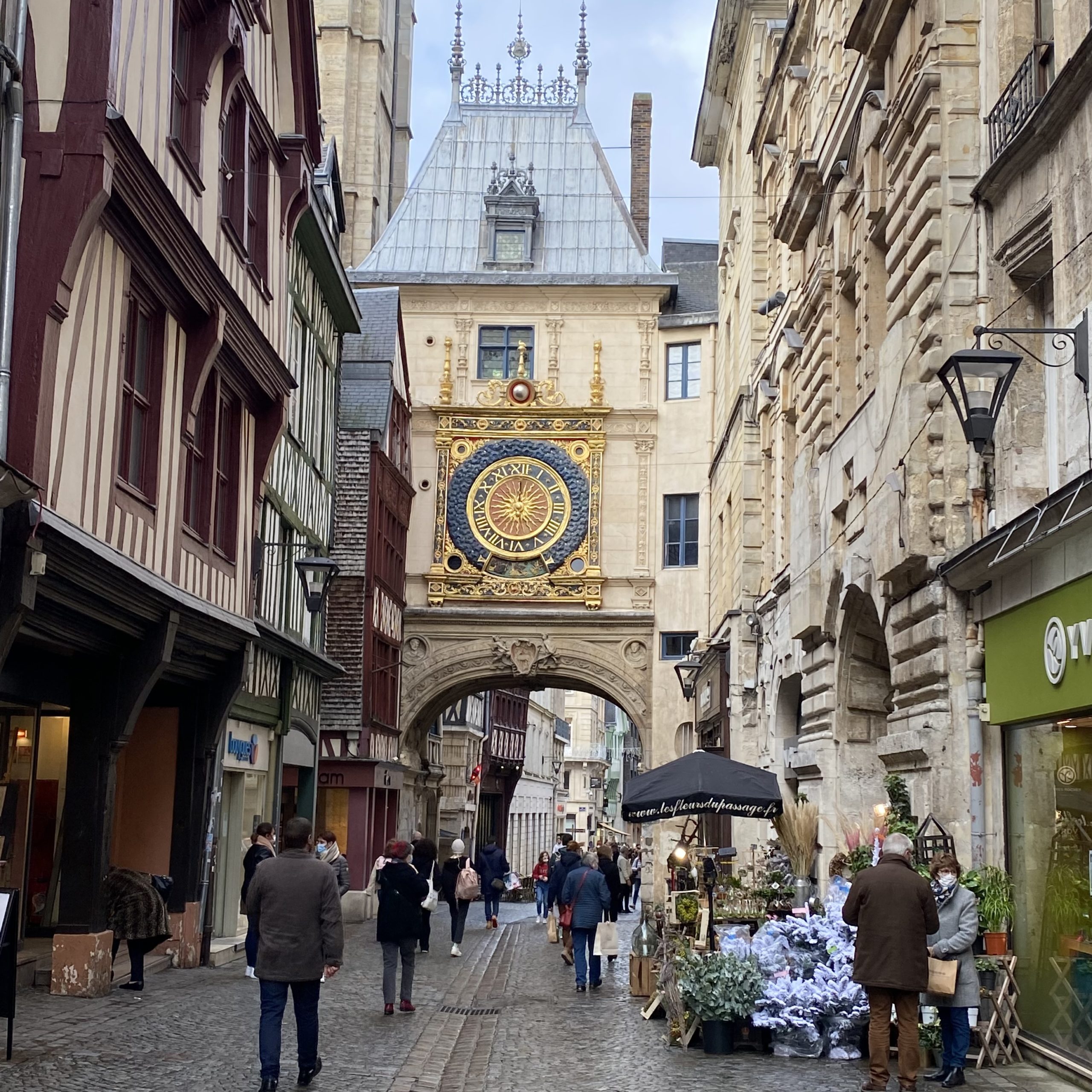 Next drive by, the Gros-Horloge, a giant Renaissance clock, which hangs in the middle of the historic pedestrian district with its golden face shining down on all the passerbys.