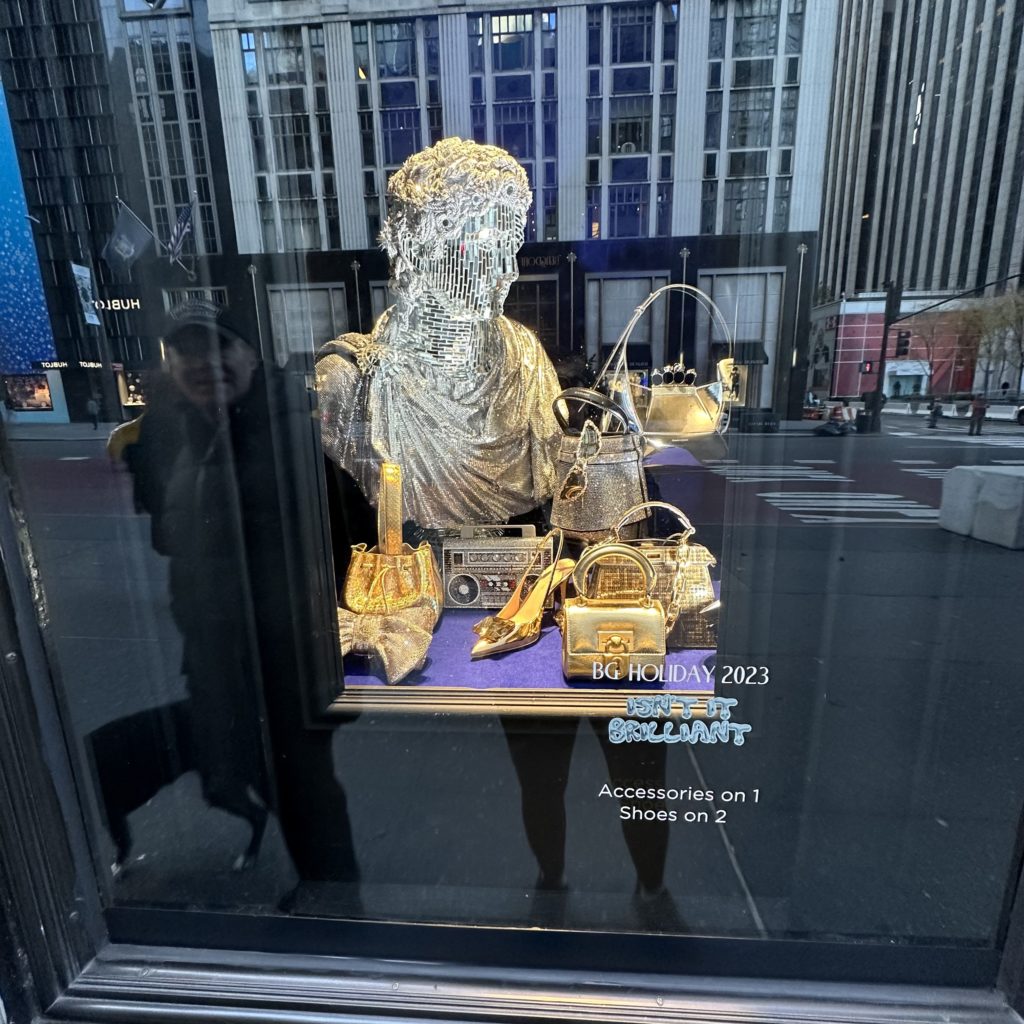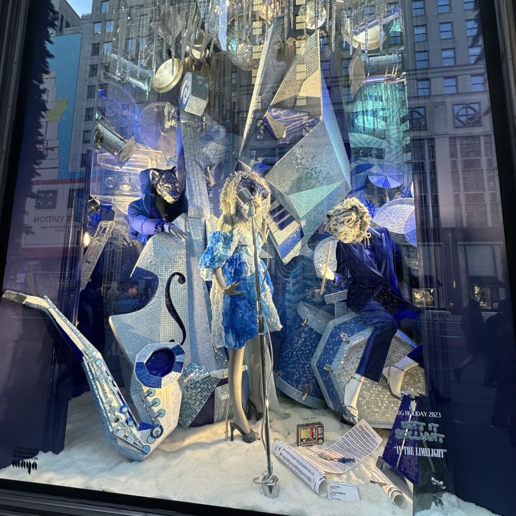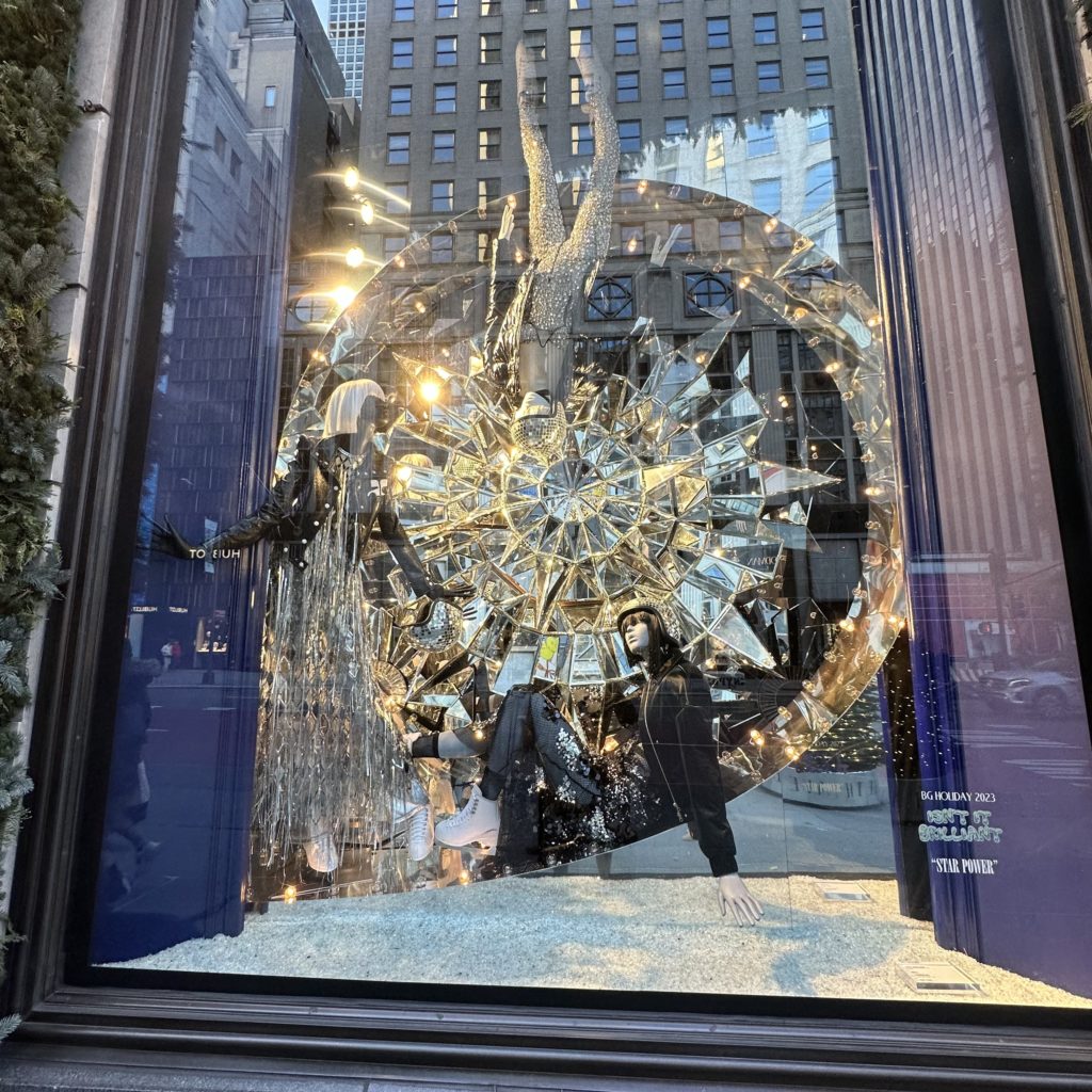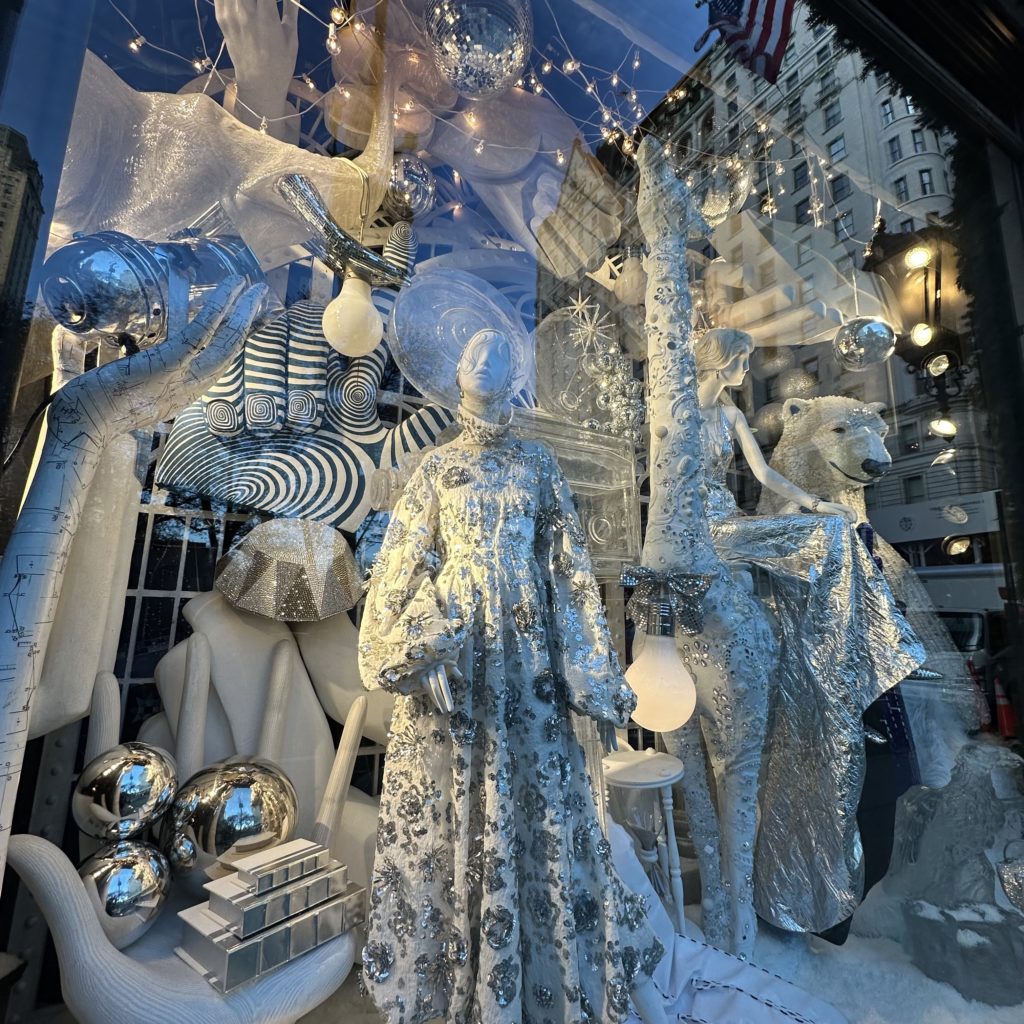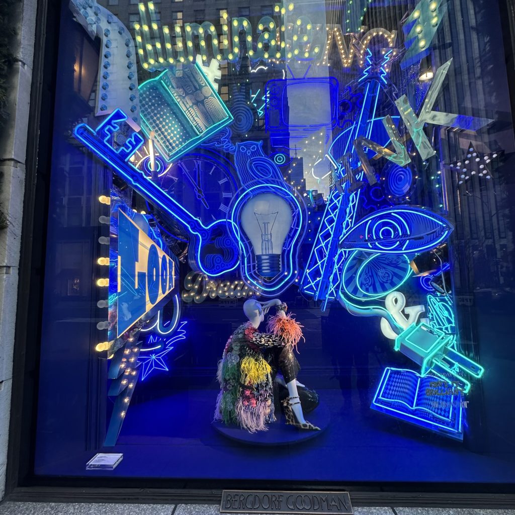 Articulating this year’s theme, Bergdorf Goodman, is featuring windows blazing with lights, mirrors, chrome, ice, dazzling surfaces, and bright neon.